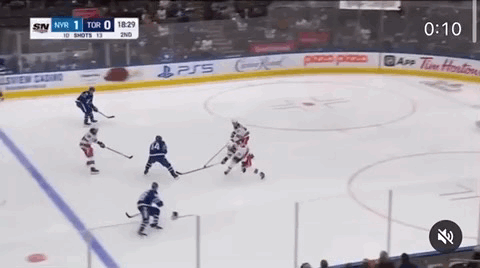 The Leafs definitely started on time this game, getting chances right out of the gate, but it was the Rangers who struck first. Jack Campbell attempted to make a pass up the boards but didn’t get enough on it, leading to a turnover. Mika Zibanejad took advantage, stepping in to the top of the circles and snapping a shot that went over Campbell’s shoulder, off the post and in. Initially, the goal wasn’t noticed, but a review later showed that it had in fact gone in, putting the Rangers up 1-0. I’ll go to bat for Jack Campbell until the day I die, but this is a scenario where you’d probably rather have him either leave the puck behind the net or not go out to play it at all. I’m of the camp that thinks that goalies should just not play the puck anymore, it ends in disaster far too often.